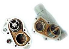 (1)殼體 水泵殼體由鑄鐵或鑄鋁制成。鑄鐵殼體壁厚且質(zhì)量大,很多鑄鐵殼體上還帶有部分水道和節(jié)溫器安裝室,這使得殼體的重量進(jìn)一步增加。大多數(shù)水泵采用了鑄鋁殼體,而且殼體的尺寸越來越小,很多殼體已經(jīng)不再具有水道的功能。
