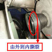 造成此故障的現象:發電機皮帶被撕裂成條狀,具體圖片參見下圖 造成此故障的原因分析:發電機皮帶輪與風扇皮帶輪不在同一個平面上,另外發電機皮帶輪與風扇皮帶輪的倒角過小,導致皮帶被撕成條狀。 此故障的維修解決方法:更換發電機皮帶、皮帶輪或調整皮帶輪在同一個平面上。通常是在發電機的安裝支架上加墊片,將發電機向前移動1-2毫米。
