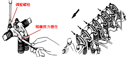 4.盤轉曲軸360度,按“雙排不進”方法調整4缸上止點時氣門間隙