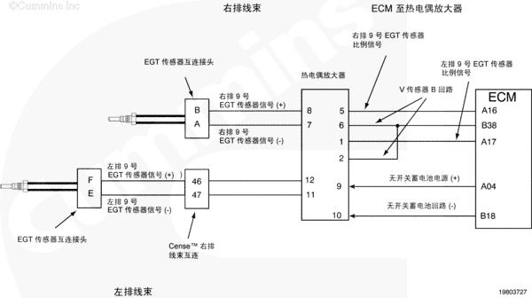 當鑰匙處于 ON(接通)或者康明斯發動機運轉時,可以使用 Insite™ 來監測排氣溫度傳感器的溫度值以快速檢查電路圖工作情況。有三個傳感器連接到右排線束上的一個接頭。為了進行系統快速檢查,從有故障代碼的傳感器上斷開傳感器接頭。INSITE™ 讀取到的所有傳感器溫度,除了 9 號排氣溫度傳感器之外,都應為非常低。如果斷開了與 7 號和 8 號排氣溫度傳感器相關的接頭,則 9 號排氣溫度傳感器讀取到的溫度值會非常高。短接每個傳感器的傳感器觸針“排氣溫度傳感器信號(正極)和排氣溫度傳感器信號(負極)”。Insite™ 中新的冷連接點處同一接頭上的傳感器的溫度讀數都將近似相同。這表示線束、熱電偶放大器和 CENSE™ ECM 正常工作,但傳感器有故障。如果接頭、線束、熱電偶放大器或者 CENSE™ ECM 有間歇性、故障或者腐蝕的連接,則有故障代碼的排氣溫度傳感器的溫度值響應將不會如上所述。將需要對系統的其余部分進行故障診斷以確定有故障的部件。該過程假定同一個傳感器