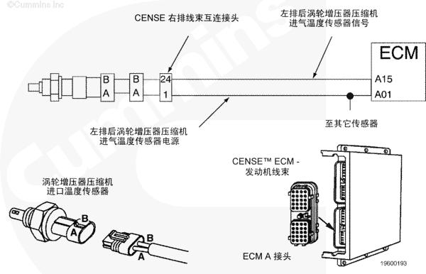 左排后渦輪增壓器壓縮機進口溫度傳感器向 CENSE™ ECM 提供左排后渦輪增壓器壓縮機進口溫度信號。傳感器的電阻值隨溫度變化。CENSE™ ECM 通過監測與傳感器串連的內部電阻器兩端的電壓檢測傳感器電阻的變化。內部電阻器兩端電壓的變化被轉換成溫度的變化。
