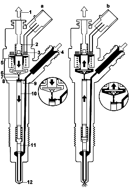 當噴油器的電磁閥被觸發,泄油孔被打開,這引起控制腔的壓力下降,結果,活塞上的液壓力也隨之下降,一旦液壓力降至低于作用于噴油嘴針閥承壓面上的力,針閥被打開,燃油經噴孔噴入燃燒室。這種對噴油嘴針閥的不直接控制采用了一套液壓力放大系統,因為快速打開針閥所需的力不能直接由電磁閥產生,所謂的打開針閥所需的控制作用,是通過電磁閥打開泄油孔使得控制腔壓力降低,從而打開針閥。