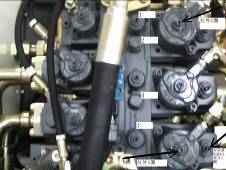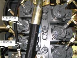 ⑴把排氣管先接到下圖中標(biāo)⑴的測試口上排氣,等到流出的油液中沒有氣泡為止。擰下排氣管再接到下圖中標(biāo)⑵的測試口上排氣,動臂上下運(yùn)動約7分鐘,直到流出的油液中沒有氣泡為止。