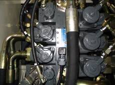 按下控制屏上“F3”鍵,和“兔子開關(guān)”按鈕,快速收回斗桿,讀出回油壓力,應(yīng)為110 bar,如果不對,就調(diào)斗桿油缸上的節(jié)流閥,使之達(dá)到目的100 bar