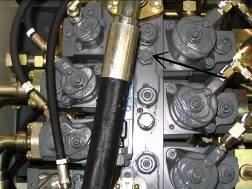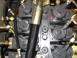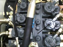 按下控制屏上“F3”鍵,快速回收鏟斗,讀出回油壓力,應(yīng)為90--100 bar,如果達(dá)不到,就調(diào)工作閥塊第二個黑六角螺釘,如下圖。