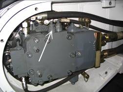 按下控制屏上“壓力等級”鍵,大臂升到極限。測泵1的壓力,調(diào)下圖的內(nèi)六角螺釘使壓力達(dá)到380 bar,