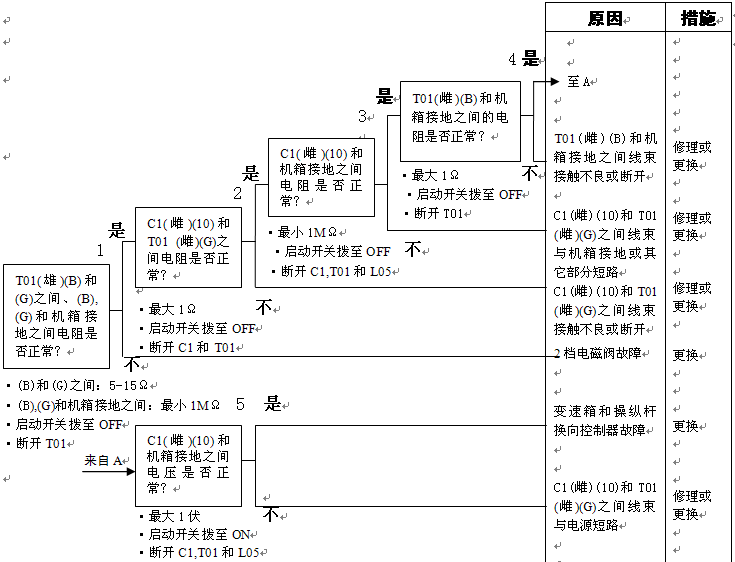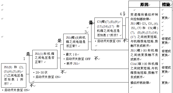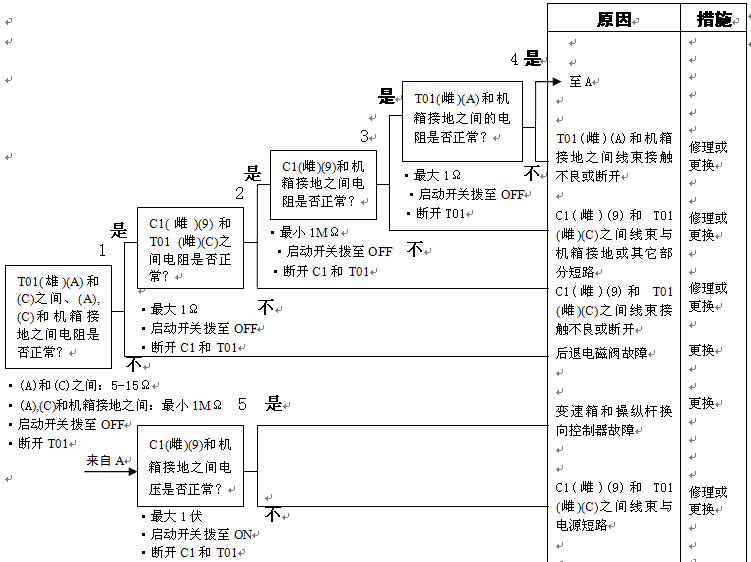 1)變速箱和操縱桿控制器C1(雌)(3)和機(jī)箱接地之間的電阻:5-15Ω 2)變速箱和操縱桿控制器C1(3)和機(jī)箱接地在空擋時(shí)的電壓:小于1伏 |