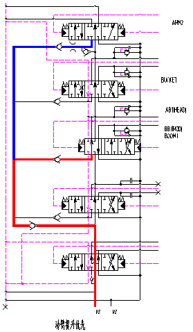 動臂提升合流BOOM2閥把泵1的流量引到動臂大腔,實現合流。