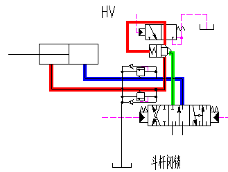 1.2.6斗桿、動臂閉鎖,為防止斗桿下掉,閥組內裝有斗桿閉鎖閥,它由控制閥HV和錐閥構成,其原理如下圖: