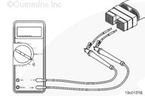 從 ECU 上斷開 OEM 線束接頭。將測試導線插入 OEM 線束接頭上的 SAE J1939 數據通信接口正極 (+) 觸針,并將其連接到萬用表表筆。使萬用表的另一根表筆接觸發動機缸體或底盤接地。