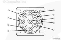 如果提供了(屏蔽)觸針,則測量 9-針 Deutsch™ 接頭的 SAE J1939 數據通信接口(屏蔽)觸針與發動機缸體或底盤接地之間的電阻。SAE J1939 數據通信接口屏蔽必須接地在車輛蓄電池接地處。萬用表必須顯示為閉路(10 歐姆或更小)。如果電路不是閉路,請參考《OEM 故障診斷及排除手冊》了解維修說明。