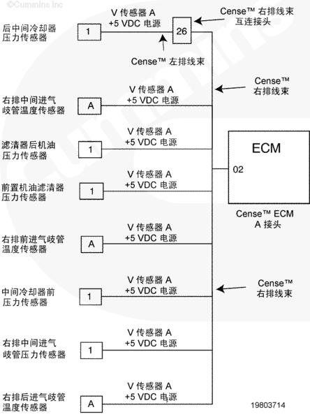 康明斯QSK78電子控制模塊 (ECM) 通過(guò) CENSE™ ECM A 接頭上的觸針 01 向 CENSE™ 線(xiàn)束上的傳感器提供 +5 VDC 供電。當(dāng)一個(gè)大于 5 VDC 的電壓源短接到該電路圖時(shí),所有連接到該傳感器的電源都會(huì)發(fā)生多個(gè)故障。發(fā)生這種情況是因?yàn)樗羞B接到該電源的部件信號(hào)電路圖電壓將上升到高于該部件的超出正常范圍(高壓短路)閾值。