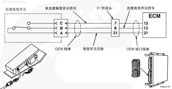 怠速有效信號(hào)在 CM500 ECM 檢測(cè)到不正確的有效信號(hào)時(shí)禁用油門(mén)控制,這是一個(gè)安全特性。怠速有效開(kāi)關(guān)通過(guò) OEM 線(xiàn)束和 OEM 接口線(xiàn)束向 CM500 ECM 提供怠速和非怠速有效信號(hào)。