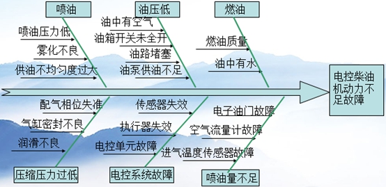 柴油中混入水分,或油路中存有空氣; 柴油質量不符合規定要求; 油箱開關未完全打開、電動輸油泵有故障(供油不足),或燃油管路部分阻塞; 空氣濾清器或進氣管道阻塞; 排氣管積炭過多,或不適當地將排氣管道改細、加長; 排氣催化裝置有故障 |