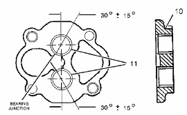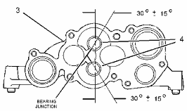 使用工具 (B) ,將套筒軸承 (4) 安裝到泵體 (3) 中。 軸承接頭應(yīng)距兩個(gè)軸承孔中心線 30 ± 15 度。 安裝套筒軸承,使套筒軸承與泵體的外側(cè)齊平。