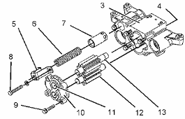 使用清潔的發(fā)動(dòng)機(jī)機(jī)油潤(rùn)滑惰齒輪和驅(qū)動(dòng)齒輪。 使用清潔的發(fā)動(dòng)機(jī)機(jī)油潤(rùn)滑套筒軸承 (4) 。 將惰齒輪 (12) 和驅(qū)動(dòng)齒輪 (13) 安裝到泵體 (3) 中。