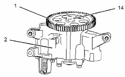 將驅(qū)動(dòng)齒輪 (1) 安裝在發(fā)動(dòng)機(jī)機(jī)油泵 (2) 泵軸上。 安裝螺栓 (14) 。 擰緊螺栓至扭矩為 55 ± 10 N·m (41 ± 7 lb ft)。