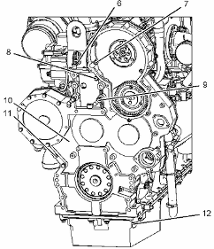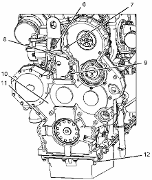 檢查凸輪軸齒輪與可調節惰輪齒輪組件之間的齒隙。 此齒隙應為 0.356 ± 0.254 mm (0.014 ± 0.010 in)。 參考測試和調整, "齒輪總成(前)- 正時",以了解齒隙調整步驟。擰緊螺母 (12) 和螺栓至扭矩為 55 ± 10 N·m (41 ± 7 lb ft)。
