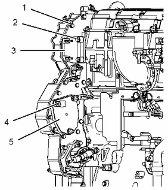 將適當的起吊設備連接在前齒輪室 (10) 上。 前齒輪室 (10) 的重量約為 57 kg (125 lb)。 拆卸螺栓 (11) 。