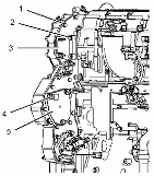 將齒輪組組件 (1) 安置在樞軸上。確保對準塔齒輪組件與曲軸齒輪上的正時標記。