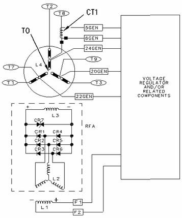 卡特彼勒SR4B 發(fā)電機自勵磁發(fā)電機配線圖 (CR1-C6) 二級管 (CR7) 變阻器 (L1) 勵磁機磁場(定子) (L2) 勵磁機電樞(轉子) (L3) 主磁場(轉子) (L4) 主電樞(定子) (RFA) 旋轉磁場總成 (CT1) 選裝的電壓降變壓器 (T0、T1、T2、T3、T7、T8、T9) 發(fā)電機端子 |