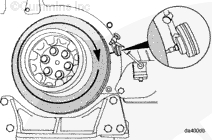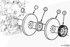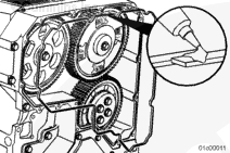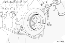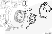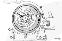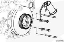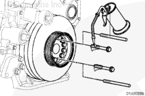按圖示在齒輪室蓋上安裝一個千分表,測量減振器的偏心度(不圓度)。