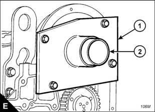 2 Fit the camshaft guide (E), GE5007, to the gear case cover, but do not tighten the bolts fully.