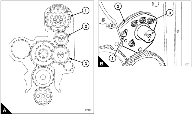 Remove the main idler gear (A). Hold the camshaft gear stationary and use a dial tes t indicator (DTI),