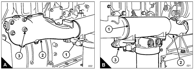 4 Remove the four bolts which retain the oil cooler (B) on the oil filter header (B).
