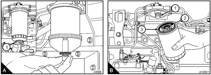 注意:工廠裝配的一些濾罐的螺紋接頭涂抹有特殊密封膠。維修時提供的濾罐代之以內部密封組件(B2)。密封膠由膠夾固定在合適的位置上。如果未正確裝配濾罐密封,則可能會導致燃油噴油泵損壞。