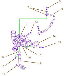 注:回油管組件(9)上法蘭需用6mm調整螺釘(8)固定到渦輪增壓器(1)上。回油管組件(9)下法蘭需用8mm調整螺釘(11)固定到缸體上。
