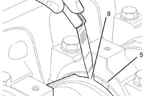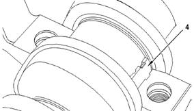 4.用適當的工具,從軸承凸舌對面(4)推壓上軸瓦。推動軸瓦(4)的同時,小心地轉動曲軸。從缸體上拆下上軸瓦(4)。為保證正確安裝,將所有軸瓦(4)的上半部分放在一起。