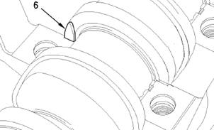 10.用清潔的發動機機油輕輕潤滑上止推墊圈(6)。將上止推墊圈(6)安裝到缸體中相應主軸承的每側。上部止推墊圈(6)中的凹槽必須抵到曲軸上。如有必要,將曲軸移至前部或后部,以安裝止推墊圈(6)。