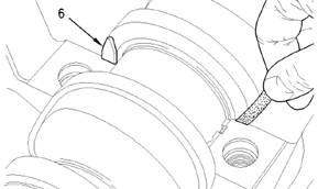 7.用適當的工具,從缸體相應主軸承兩側拆下止推墊圈(6)的上半部分。推壓止推墊圈(6)的同時,小心地轉動曲軸。為了松開過緊的止推墊圈(6),如有必要,將曲軸移到發動機前部或后部。