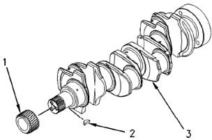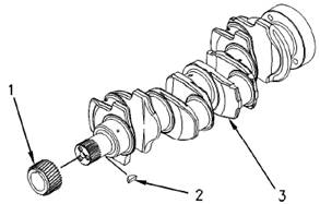 注:曲軸齒輪(1)可能在曲軸(3)上與其滑動(dòng)配合。如果將曲軸(3)安裝在發(fā)動(dòng)機(jī)內(nèi),先使用一個(gè)合適的工具,以確保曲軸齒輪(1)不是滑動(dòng)配合,然后再?gòu)陌l(fā)動(dòng)機(jī)上拆除曲軸。