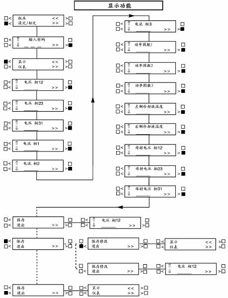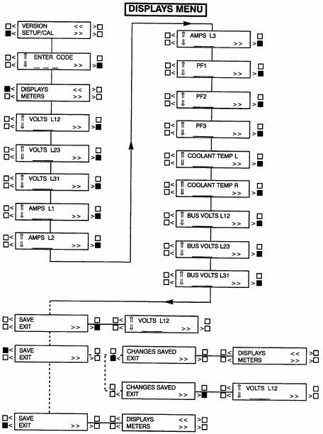 選擇“顯示”(DISPLAYS)進(jìn)入顯示(DISPLAYS)子功能,按“⇑”和“⇓”符號(hào)旁邊的按鍵以標(biāo)定選擇的電壓、電流、功率因數(shù)和冷卻液溫度讀數(shù),按“>>”符號(hào)旁邊的按鍵將程序移至下一項(xiàng)目。