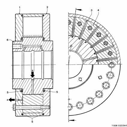 描述:引擎的動力通過驅動端聯軸器傳遞到發電機。它由一個鋼彈簧聯軸器和一個彎曲耦合器a flexural coupling,兩個聯軸器間由中間管8連接。鋼彈簧聯軸器為液壓減震聯軸器,扭矩的傳遞以及振動的降低是靠放射狀布置在星形架上的彈簧片實現的,板簧將聯軸器的星形架和外部構件連接起來,其結構和作用原理與減震器相同此處不再敘述。
