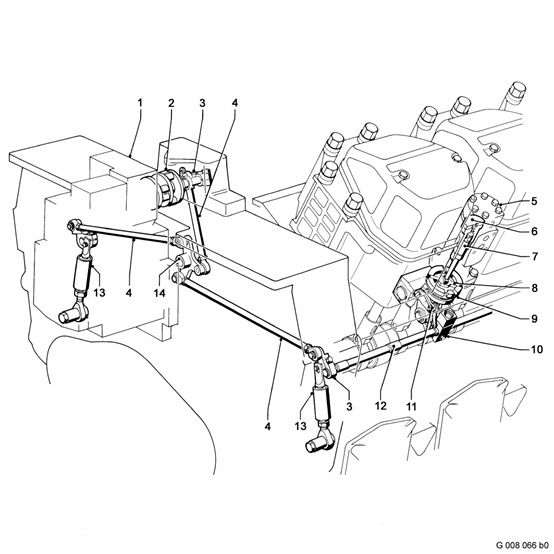 11、鉸接式連接 12、油門控制桿 13、油門回復機構 14、中央杠桿