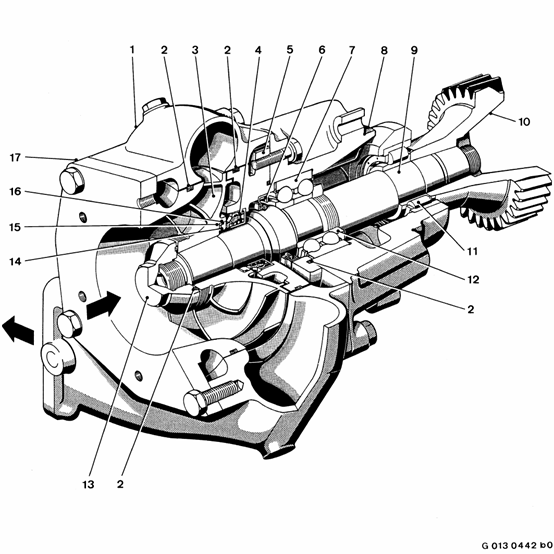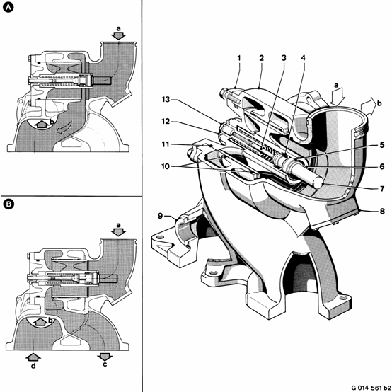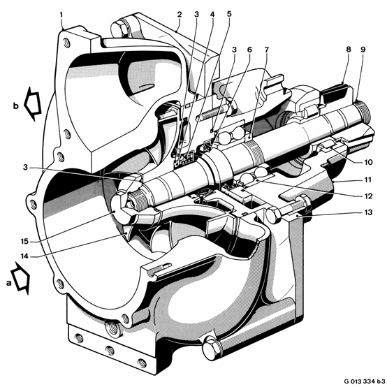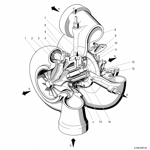 描述:高壓級渦輪增壓機由渦輪機和壓氣機組成,機身總重45kg,最大轉速58000rpm,由德國MTU,Friedrichshafen公司生產,型號ZR 170/087 ,該機分為渦輪,軸承室和壓氣機三大部分。渦輪機由螺栓和墊片固定在與軸承室固定在一起,壓氣機及其進氣室也固定在軸承室上,壓氣機和軸承室都是靠水冷的。轉子由焊接在軸上的渦輪2和用螺栓固定在軸上的壓氣機葉輪10組成,安裝在軸承室內的軸承襯套14上,且在軸承室兩側布置有推力軸承,以消除軸向力對渦輪增壓機的影響。柴油機潤滑油系統的壓力油在潤滑軸承套的同時也對軸承室及轉軸進行了冷卻。轉軸上的軸封環13用以阻止軸承室潤滑油進入渦輪機和壓氣機的進排氣管,同時也防止兩側的進排氣穿過軸承造成進排氣竄氣。在壓氣機葉輪后面布置有一個密封空氣逆止閥,開啟壓力為0.1bar,其作用是將壓氣機內具有一定壓力的空氣引出,用以加強密封環的密封效果。隔熱板3和阻熱盤4的作用是防止渦輪機側軸承過熱。