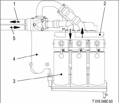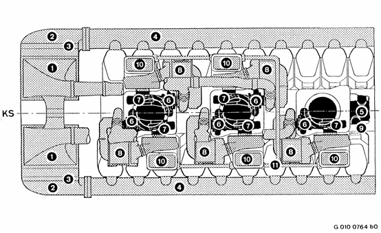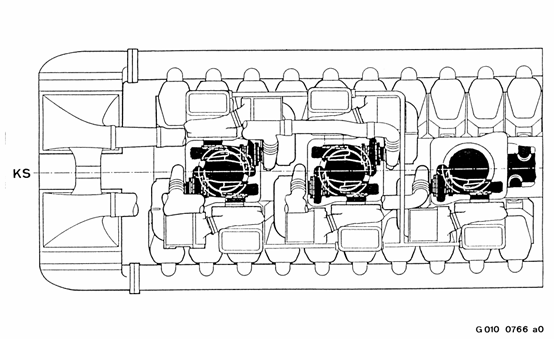 描述:柴油機裝備有二級渦輪增壓系統,渦輪增壓系統由五組增壓機組成,每一組增壓機又分為第一級增壓和第二級增壓,渦輪增壓機組安裝在機身上方的排氣管處,其是否投運取決于柴油機的功率。渦輪機安裝在冷卻水室和排氣管上方,該冷卻水室用以保證渦輪機軸承的冷卻。將渦輪機安裝在排氣管的正上方是為了降低熱損耗,并且可以保證機身外側的溫度達到相應的標準。