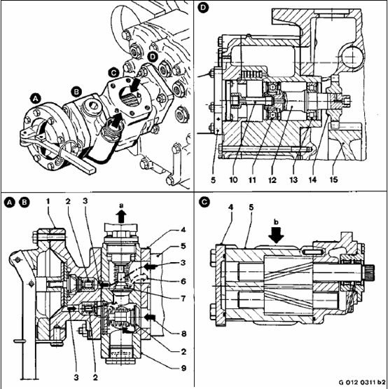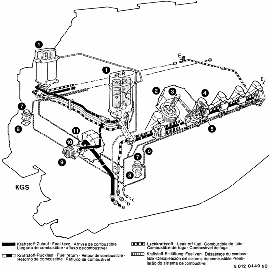 描述:曲軸箱呼吸器與壓氣機的進氣相連,在曲軸箱內形成微負壓,壓氣機把油氣混合氣體從曲軸箱的吸入管線b處吸到進氣氣室和壓縮空氣氣室之間的凝結機構中,混合氣中的油粒子會被分離到凝結機構中冷凝,凝結后的油通過回油管道(虹吸管)送回到曲軸箱中。