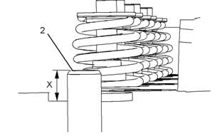 5檢查氣門導管(2)的凸出(X)。氣門導管應比氣門彈簧凹槽高出12.7mm(0.500in)。有關更多資料,請參閱《技術規格》,“缸蓋氣門”。