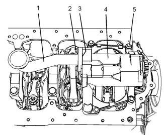 3卸下 螺栓 (5)。 將發 動機 機油泵 組件 (4) 從 缸體上卸 下。