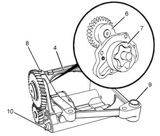 4如有 必要, 從發 動機機 油泵 的前 蓋組件 (6) 上 卸下螺 栓 (10)。 從 發動 機機 油泵 (4) 上卸 下前蓋組件 (6)。
