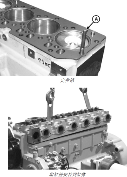 重要提示: 如果缸蓋在缸體上,調整缸蓋位置時會損壞缸墊。應通過安裝和使用定位銷 (A) 將缸蓋定位在缸體上。