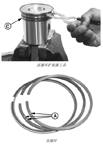 2. 將控油環(huán) (C) 裝入底部環(huán)槽,套在控油環(huán)擴(kuò)張器上。安裝時(shí),從擴(kuò)張器開(kāi)口方向看,活塞環(huán)缺口間隙應(yīng)位于活塞對(duì)側(cè)。