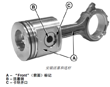 重要提示: 活塞必須安裝到原先從連桿拆下的位置,還必須使用新的活塞銷(xiāo)卡環(huán)。必須正確安裝活塞和連桿,這樣當(dāng)連桿長(zhǎng)軸面向John Deere約翰迪爾強(qiáng)鹿柴油發(fā)動(dòng)機(jī)凸輪軸一側(cè)時(shí),活塞燃燒碗應(yīng)移向John Deere約翰迪爾強(qiáng)鹿柴油發(fā)動(dòng)機(jī)噴油泵一側(cè)。