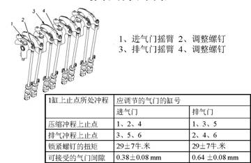 1、進氣門搖臂 2、調整螺釘 3、排氣門搖臂 4、調整螺釘