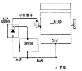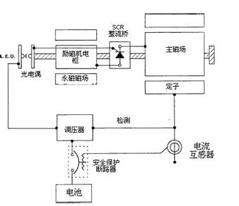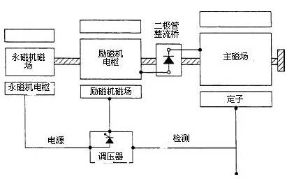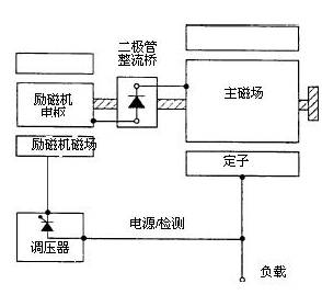 該系統采用繞制的勵磁電樞,它與主磁場同軸旋轉。通過將主發電機的交流輸出的一小部分整流,調壓器給勵磁機磁場提供可調的直流電源。