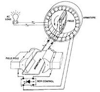 這種發電機通常采用一小型的旋轉電樞發電機來給主發電機磁場繞組提供勵磁電源。該電源由一個二極管整流橋將交流變換成直流。這個電樞與主磁場同軸旋轉,因此不需要滑環和電刷。由于這種勵磁發電機的磁場繞組是固定的,因此其調節控制電路可以直接連接,這又消除了對電刷與滑環的需要。一個SCR(可控硅)勵磁/穩壓器被用來給磁場提供整流的直流電。SCR電路的輸入功率來自主電樞(定子)的輸出。